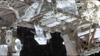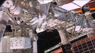 Later, while both spacewalkers were getting ready to move the third and final adapter plate, Hague reported seeing some debris. "Um, I see metal flakes coming out of the socket," Hague said. He then inspected the work site to figure out what those flakes were and where they came from, but it's still not clear what caused these flakes to appear.